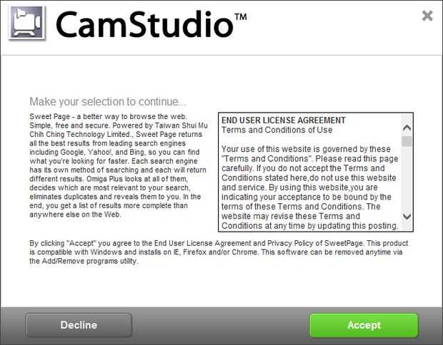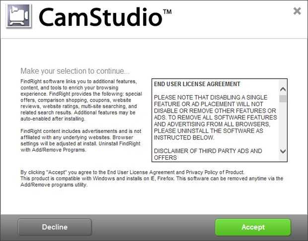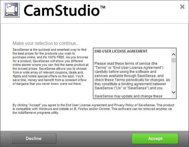 2. Ejecuta al instalador e instalar CamStudio. Sólo acepta el primer acuerdo de licencia el resto es adware!