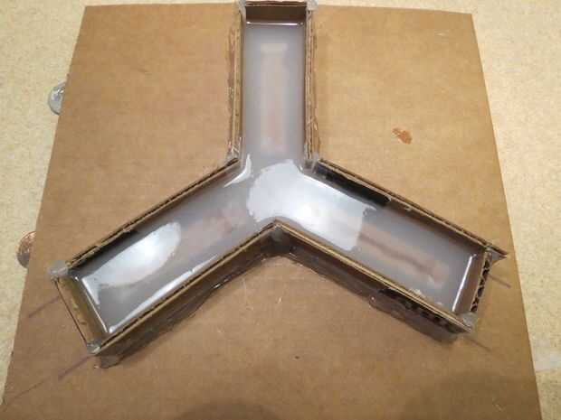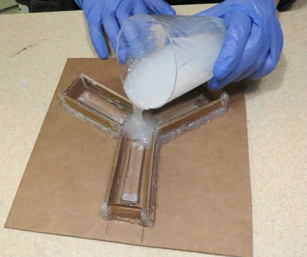 Vierta lentamente el Ecoflex mixta 00-30 en el molde para que los bloques interiores estén completamente sumergidos por al menos 1/8" de goma. No llene completamente el molde! Mira la goma durante unos minutos comprobar si el molde tiene fugas. Si esta es la situación, la cinta un fajo de toalla de papel sobre la fuga.