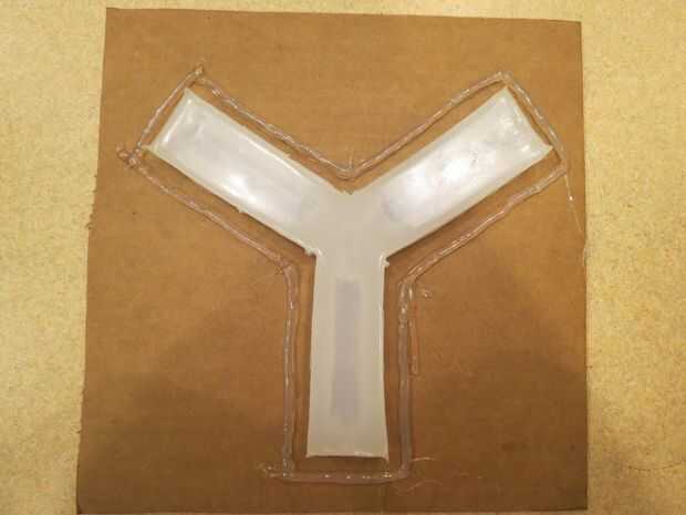 Trace el caucho con pegamento caliente, dejando aproximadamente 1/4" entre el pegamento y el caucho. Después de la primera capa se enfríe, coloque otra capa de pegamento caliente en la parte superior para hacer una pared de dos capas que rodea la goma. Esto servirá como molde para la parte inferior del robot.