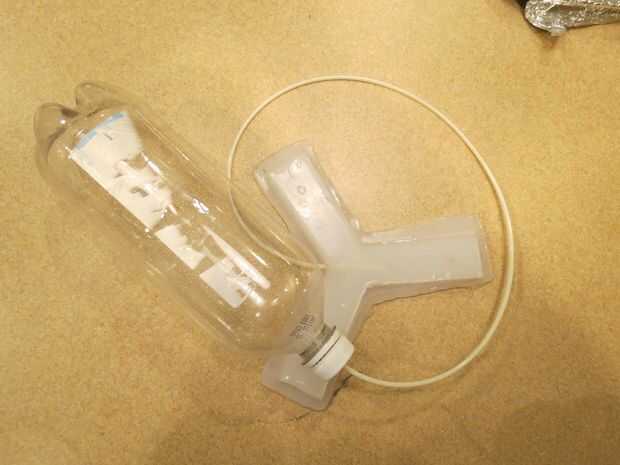 Retire el clavo e Inserte la tubería para que llegue a la cavidad central. Apriete ligeramente la botella para probar los canales de aire. Si un brazo no inflar, un canal de aire pueda bloquearse. (resolución de problemas para esto puede encontrarse en el final del instructable)