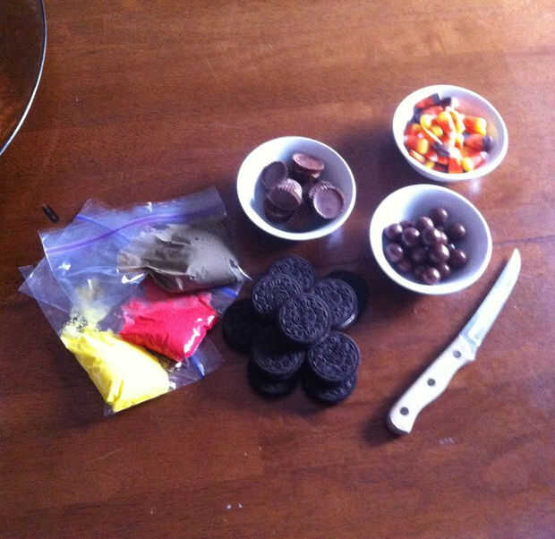 esto es un arte de Turquía comestible. Es un regalo de acción de gracias perfecto para almuerzos, cotillón y centros de mesa. Sólo requiere unos pocos ingredientes simples:1 bolsa de malvaviscos de colores mini1 Gomita grande1 naranjaPalillos de dien