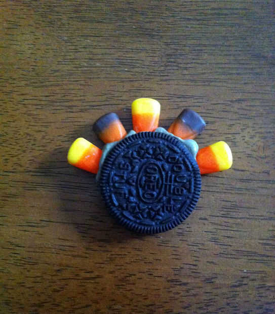 1. Introduzca 5 piezas de maíz de caramelo (punta blanca hacia abajo) en el filo helado de Oreo.