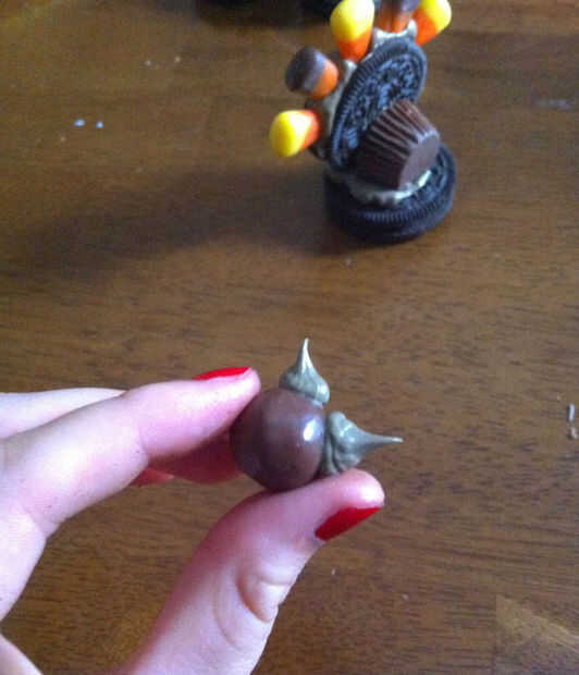 esto es un arte de Turquía comestible. Es un regalo de acción de gracias perfecto para almuerzos, cotillón y centros de mesa. Sólo requiere unos pocos ingredientes simples:1 bolsa de malvaviscos de colores mini1 Gomita grande1 naranjaPalillos de dien
