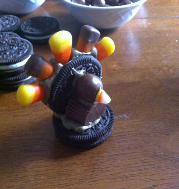 2. con escarcha amarillo ponga la punta blanca de un maíz de caramelo en la parte delantera de la mentira como el pico del pavo.