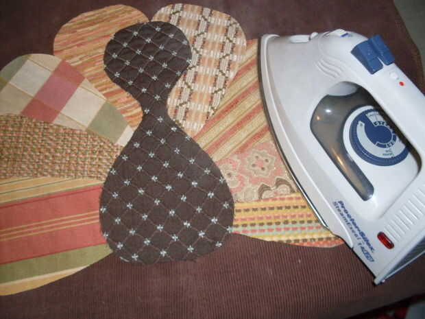Usando doble antiadherente vapor una costura, coloque una tira en la parte posterior de cada recorte. No hay necesidad para cubrir todo el lado posterior salvo que esté usando a tela muy endeble. Pegue las "plumas" en un semicírculo y el hierro con la posición de vapor sobre todo. Coloque el cuerpo sobre el centro de los extremos puntiagudos de las plumas y de hierro otra vez. Repita para el pico y el zarzo.