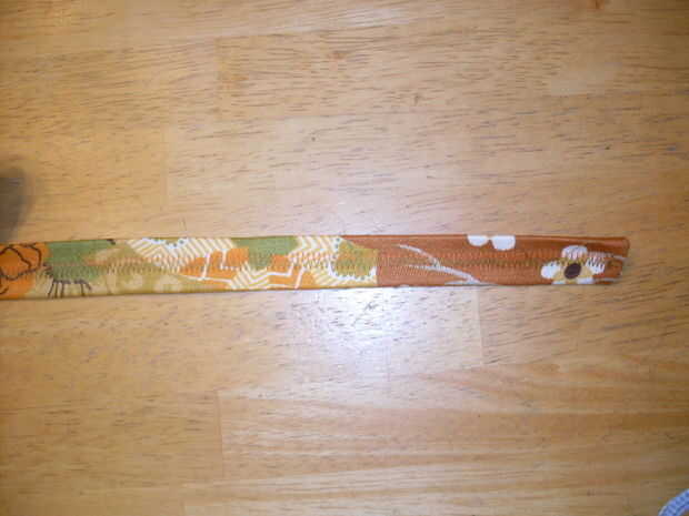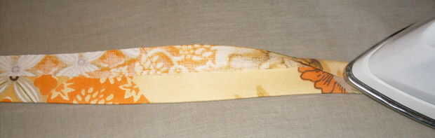 Lados: Cortar 2 tiras de tela de 2.5 pulgadas ancho y 22 pulgadas de largo. Doble en tercios, como lo haría un papel antes de colocarlo en un envolvente de largo. Hierro plano, doblar los extremos hacia adentro. Coser el centro con una puntada de zig-zag. Coser a cada lado del borde.