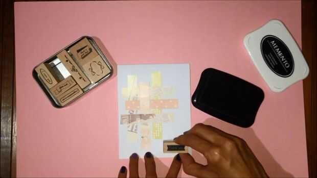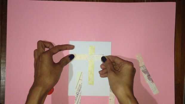 Necesita 6 tiras de papel de desecho. Cortar 3 piezas en 1 por 10 cm y 1 de 3 piezas de 8 cm. Añadir pegamento en la parte posterior de las tiras. Adherir las tiras alternando las tiras largas y cortas.