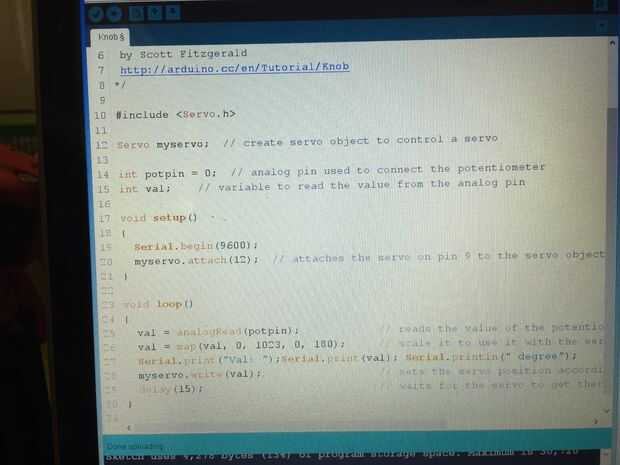 En primer lugar, necesitamos entender el ejemplo de la perilla. La función de knop mediante la retroalimentación de un potenciómetro, convertir el valor del potenciómetro (que van desde 0 ~ 1024) al valor en grados (0 ~ 180). Sin embargo el ejemplo de knop no te dice la posición de su potenciómetro así que hice un poco modificar el código.