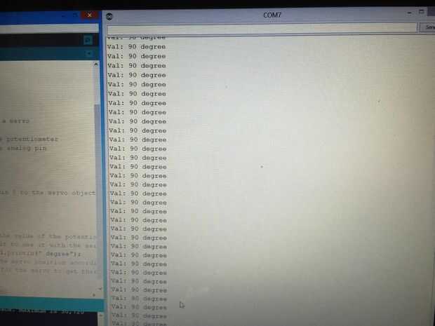 Después de cableado y cargar el código que tengo allí para ti en tu Arduino, ahora haga clic en el icono Serial monitor en la esquina derecha arriba (una lupa mini). Debería ver algo como la tercer foto, ahora el potenciómetro para volver a 90 grados en valor. Y esta es la única vez que tendrá este potenciómetro.