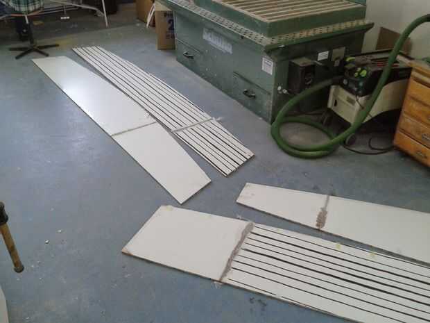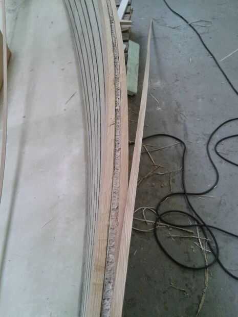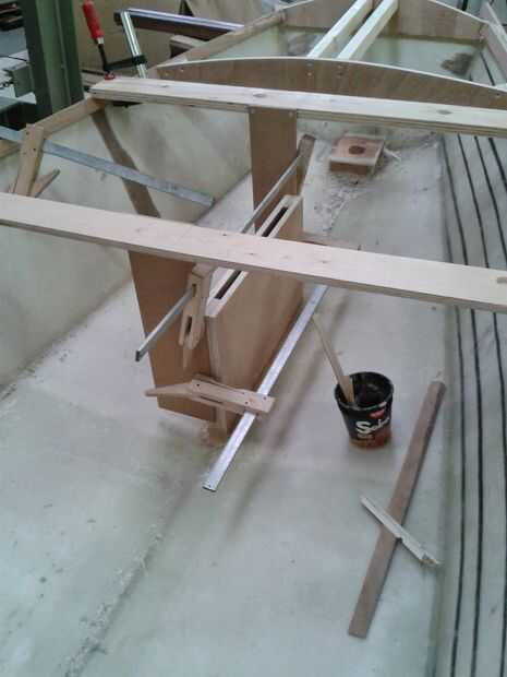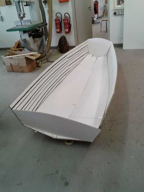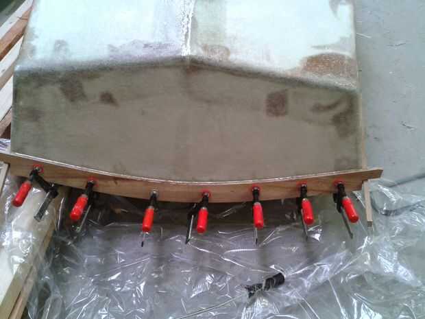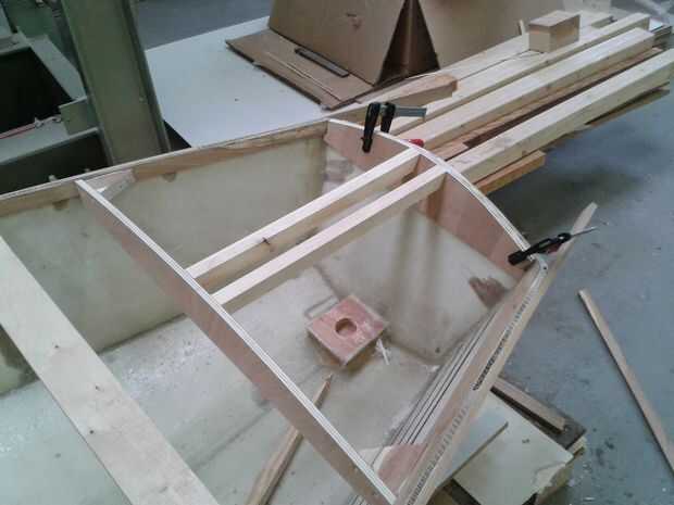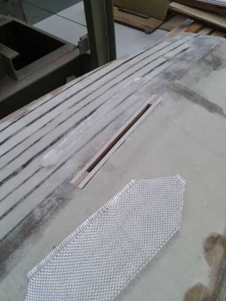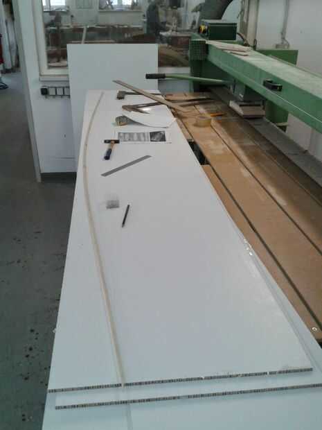 Me gusta usar cosas que "caen del camión" o no es necesario. He encontrado unas hojas de cartulina de 10mm con un panal de abejas como la estructura interior. Primero dibuja las líneas y recortar las hojas. No eran lo suficientemente largos, así que añadido piezas con epoxytape para obtener el tamaño adecuado. Lo he arreglado todas las hojas con cinta adhesiva para comprobar las partes para la corrección. Después de empecé con relleno epoxy para pegar las hojas, había hecho un radio en las esquinas y cubiertas con venda de epoxy. En el centro he utilizado venda de epoxy gran fuerte de 15cm por ambos lados. No me gusta fijar las hojas con alambre. He arreglado primero todas las hojas con cinta fuera y entonces pude colaborar completamente en el interior.