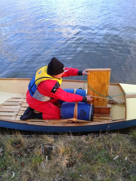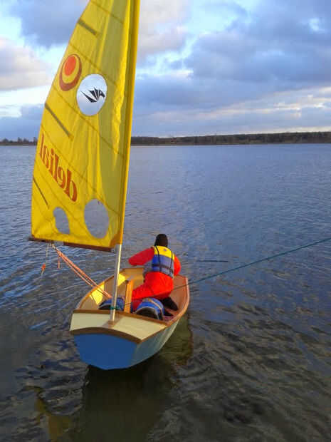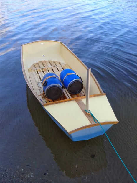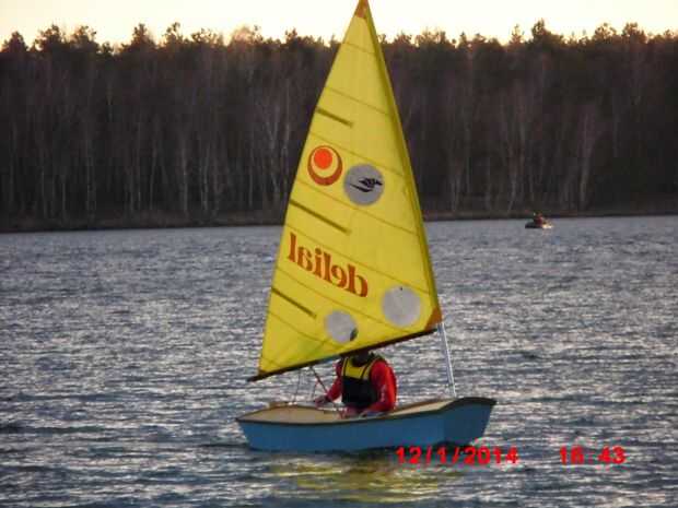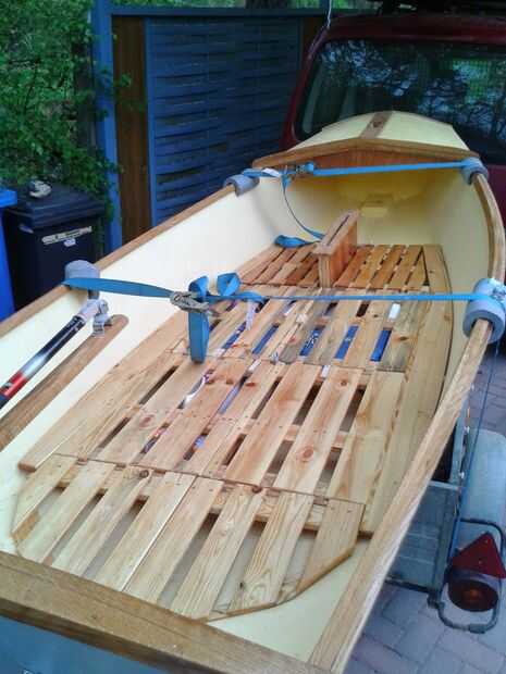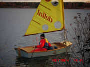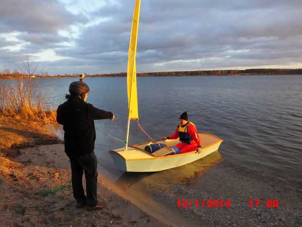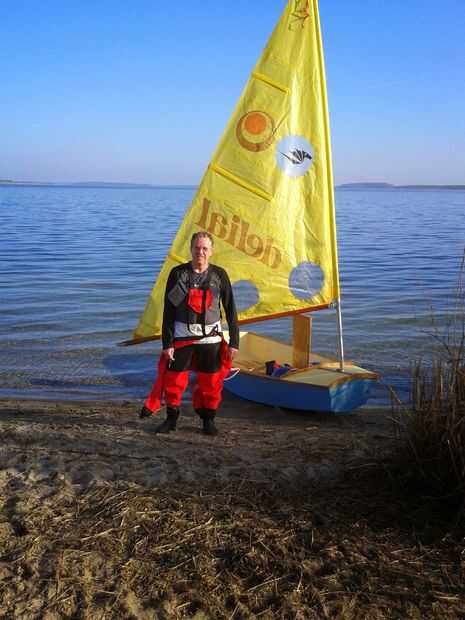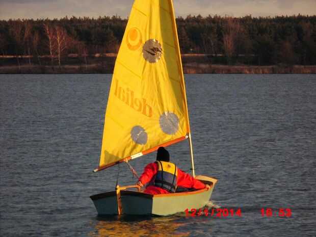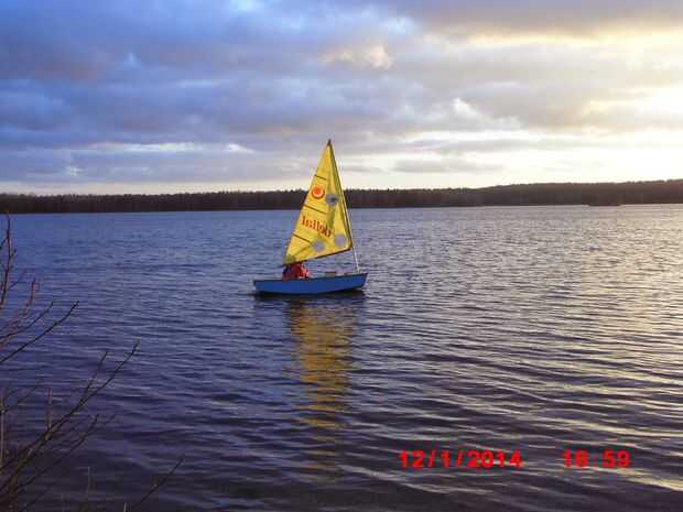 Este bote tiene una base de V. Se ha cambiado esto para obtener un fondo plano de asientos cómodos. He pensado ya que de lo contrario Deslice cada vez a la mitad. Este fue el trabajo más complicado para conseguir todas las piezas en línea recta. Para la parte inferior he utilizado palets viejos, lijar las piezas y la forma correcta. El rigg fue una vieja tabla de surf plegable. He comprado este en ebay por 15€. Luego llegó el momento de probar mi nuevo proyecto. Era enero y no el mejor momento en Europa para subirse el agua especialmente con un nuevo barco desconocido. Me he comprado un traje seco y he añadido 2 tanques de flotación y algunos Plasticbottles en las plataformas. A veces las cosas tienen que hacer! Después de instalar Ruder, vela y orza, estaba lista para navegar. Mira la foto donde se puede ver la fecha y hora.