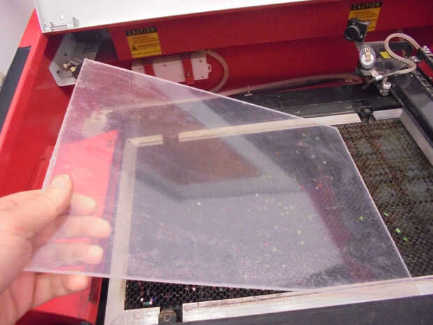 El acrílico debe tener una película protectora en ella para no eliminar esto. Cortar el acrílico a la medida de láser de corte y el lugar en la máquina.