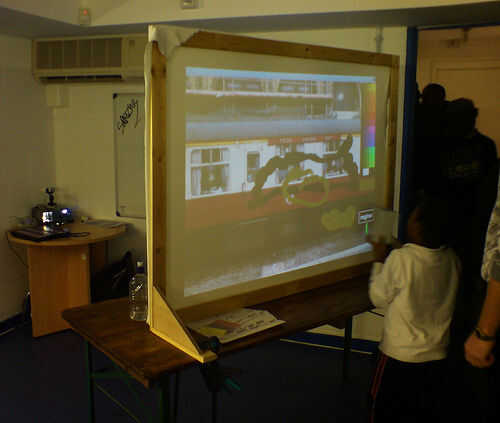 * El equipo está ejecutando un programa de pintura simple que utiliza un proyector para "pintar" las líneas mientras dibuja con el poder. También se encarga de la asignación de la cámara del wiimote en la pantalla mediante un sistema de calibración de 4 puntos.