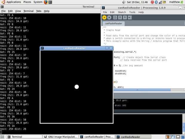 Coloque el bosquejo del proceso adjunto (canRadioReader.pde). Inicie el programa y comprobar la salida del programa. Usted debe conseguir una frecuencia (que te dice cuantas actualizaciones por segundo el receptor está recibiendo - definitivamente desea que esto sea al menos de 10Hz). También obtendrá una medición de distancia y la boquilla. Prueba de la lata moviendo el potenciómetro de boquilla y moviendo un pedazo de tarjeta en frente del sensor de distancia.