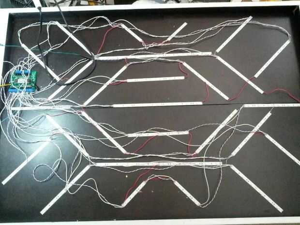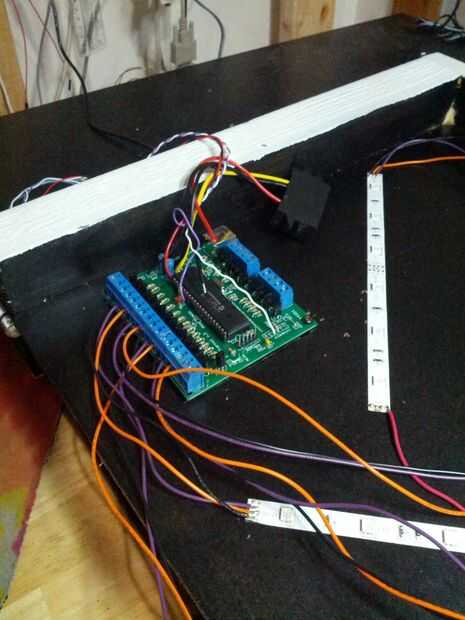 Todas las tiras de LED anodes(+12v) están conectados juntos en paralelo (cables de la Red en la primera imagen) haciendo así que simplificar cableado y en general será mucho menos cables. El color elegido para los ánodos debe ser diferente de los colores utilizados por los canales RGB, no tengo el cable de 3 hebras de rojo, verde y azul trenzado disponible cuando construí estos paneles, de lo contrario yo habría elegido blanco para los cables del ánodo, pero para los paneles se muestra, el cable rojo son los ánodos.