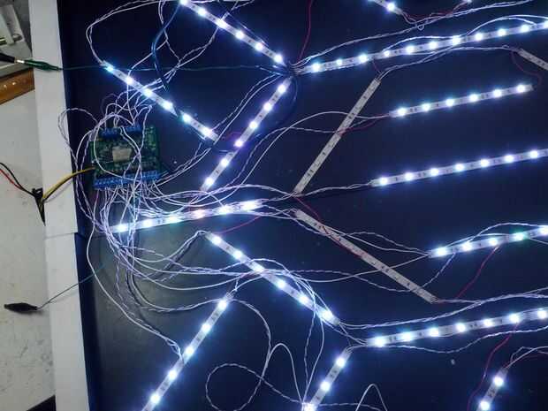 - Su forma de trabajo a través de la Margarita de panel encadenando todas las tiras de LED que pertenecen juntos en el mismo canal. Deje los cables para la conexión final al controlador hasta la última.