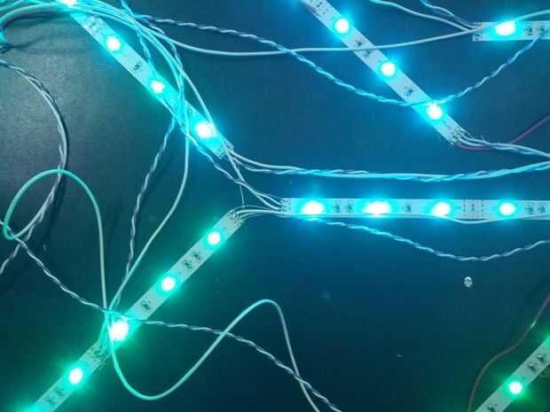 Cables RGB canal: Se trata de la mayor parte del proyecto, que puede ser tedioso pero en general no es tan difícil. Solo alambre a uno la mitad del panel a la vez, por lo que cada medio tiene sus propios cables que se conectan al controlador, que evitará que el plegamiento de los paneles de arrancar los cables de la soldadura de cojines. La idea principal es comenzar en el lado del panel más el controlador, soldar los cables en y ejecutar a la próxima tira de LED más cercano que está en el mismo canal, asegurando que el alambre puede ser de más adelante. Y su forma de trabajo a través de esencialmente daisy cadena juntos varias secciones de la tira del LED como usted trabaja su manera hacia la posición del regulador.