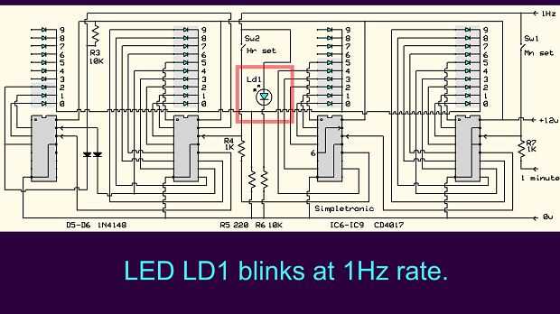 El LED LD1 parpadea cada segundo. Utilice SW1-SW2 para ajustar hora.