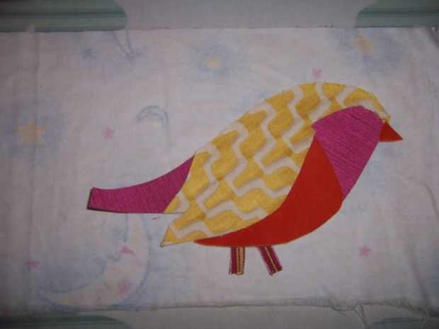 Entregó a mi retazo y planchar mi pájaro en la parte posterior. Puede elegir una tela que es similar en color a su aplicación o el mismo color que tu suéter para que no se muestran alrededor de los bordes cuando termines. Esto hará más sentido en unos pasos más. Elegí un blanco para que pudiera ver mejor en este tutorial.