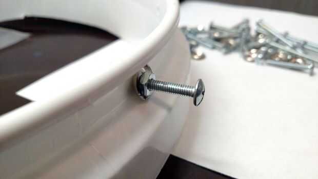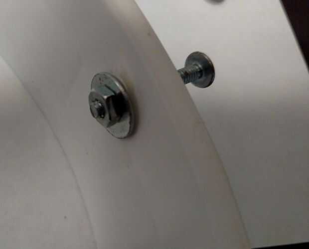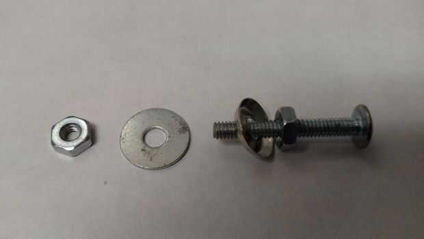 1. En primer lugar, preparé los tornillos mediante la adición de una tuerca y una arandela en cada perno. He insertado los ojales hacia abajo, haciendo la curva hacia el extremo abierto del perno. Lo hice así, porque los agujeros en el anillo son sólo contra la curvatura de la estructura y una arandela plana regular cavar en el plástico.