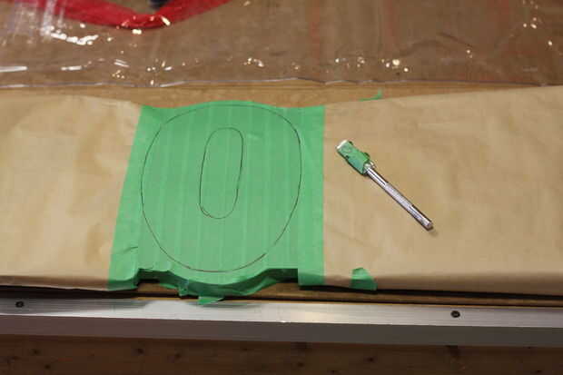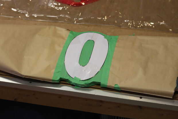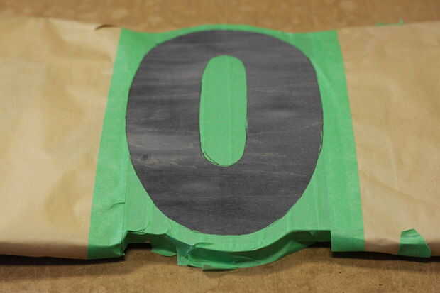 Para empezar, establecimos la cinta sobre toda el área donde se aplicaría el número. Una vez que cubrió el área con cinta adhesiva, que trazó los contornos de la '0' y cortar las piezas que queríamos añadir color.