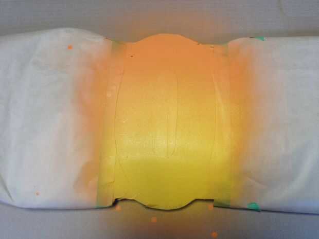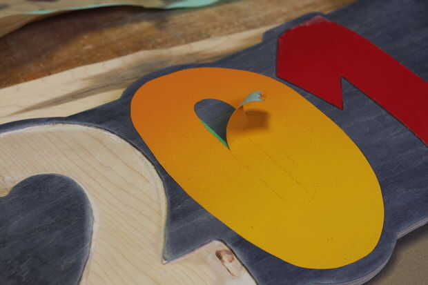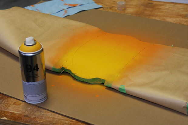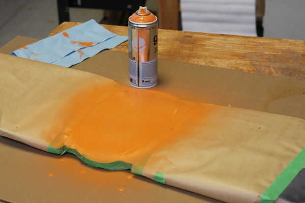 Antes de rociar la madera expuesta, cubrimos todo el tablero en papel para proteger la cubierta de cualquier accidental en aerosol. Una vez que todo estaba cubierto adecuadamente, nos rocían en múltiples capas de un color y una vez que se secó ha añadido otro color para darle un efecto de degradado.