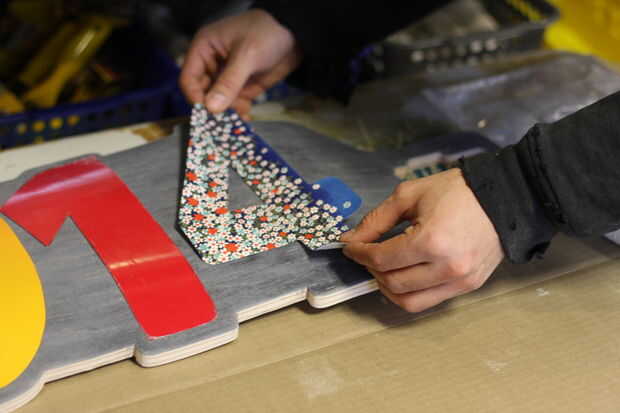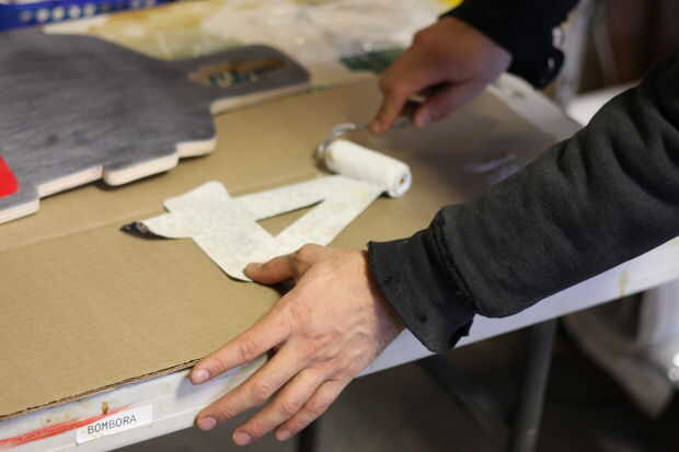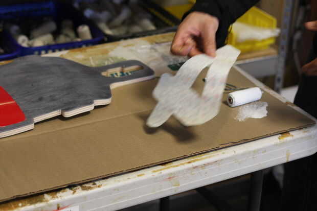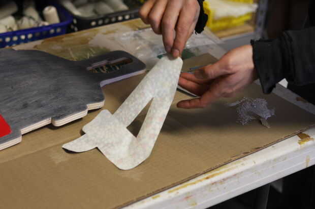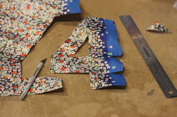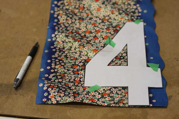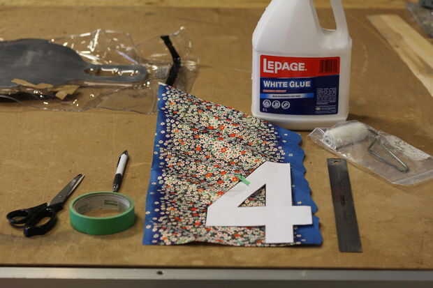 Primero se utilizó nuestra plantilla para trazar y cortar el número '4' del papel. Una vez que el papel fue cortado a la forma, se aplicó una fina capa de cola blanca multiuso en la parte posterior del papel.