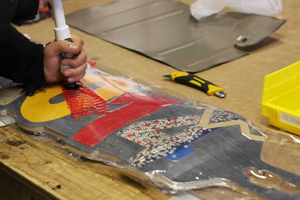 Para este número hemos querido aplicar un pedazo de fantasia de papel decorativo en la parte inferior de la Junta. Este es un gran ejemplo de cómo hacer uso de las presiones incluso de sujeción aplicadas el proceso de bolsa de la aspiradora. Papel de lujo como esta puede conseguir bastante caro, y usted quiere asegurarse de que se sienta completamente, no rip y se adhiera uniformemente a la cubierta.