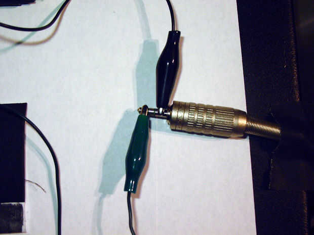 Tomar el lápiz y frote el grafito sobre el papel haciendo un rectángulo grueso, largo. Queremos que el grafito para conducir la electricidad, así que seguro que no decae. Se trata de su mezclador. Fijar un cable (blanco) a un extremo de su rectángulo. Puede que necesite cinta abajo los cables para que no se mueven. Conecte el extremo libre de ese cable a tierra en el protoboard. Toma otro cable (verde) y conectar el pin 3 de tu 7555 hasta la punta de la salida de audio/auriculares. A continuación, conecte el manguito de la toma a tierra en el protoboard (via cable negro).