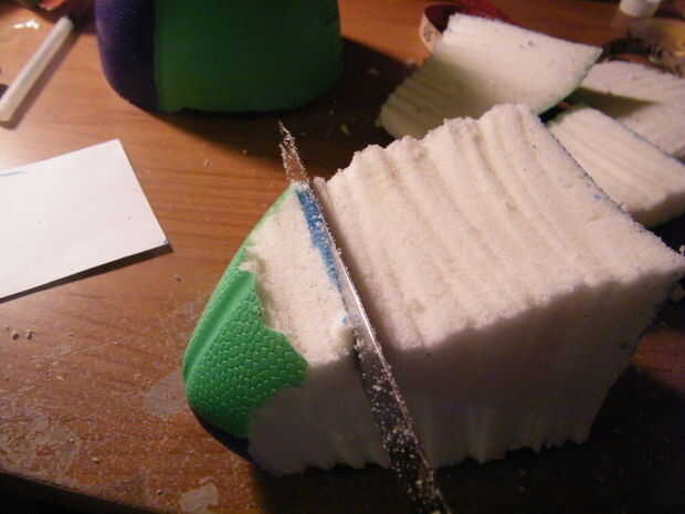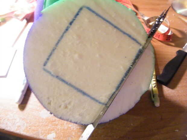 Ahora corte a lo largo de las líneas de casillas hacia el punto del fútbol, lo más recto posible. Salí con un ángulo rectángulo.