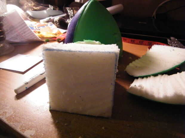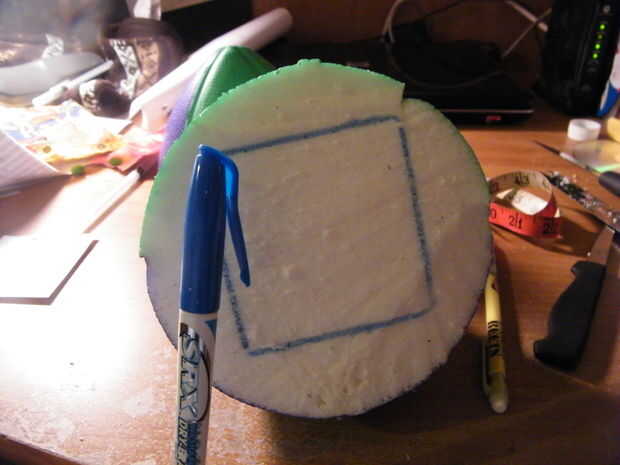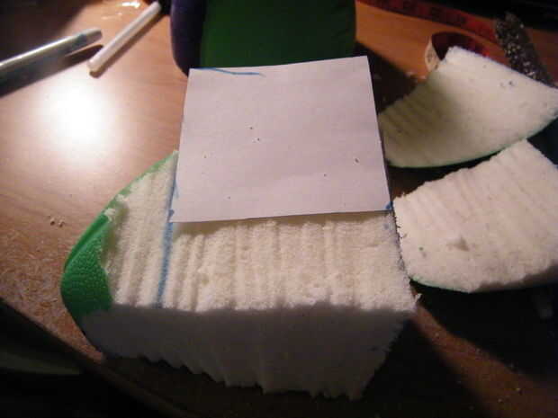 Luego coloqué la tarjeta de 3 x 3 del rectángulo, a partir de la parte delantera donde primero corte nuestro fútbol a la mitad y trazó otra plaza. Corte el extremo del balompié.