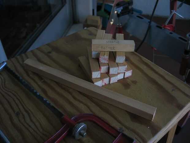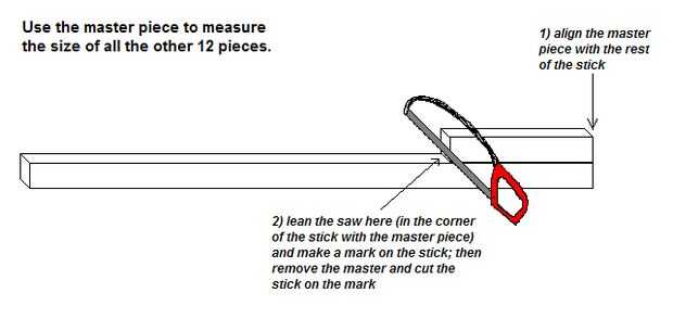Cortar otro 12, sostiene al maestro en la parte superior del palillo, alineando el comienzo y hacer una marca de corte con la sierra. Entonces el maestro puede tomar hacia fuera y corte el palo por la marca previamente hecha. Repita hasta que usted consigue 12 piezas más al maestro (13 en total). Lo siento por el cuadro dibujado de la mano no en escala; ha sido un tiempo que hice este calibre y no he tomado tanto fotos como quisiera.