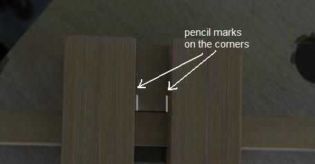 Desmontar y poner la pareja marcada en el calambre (3ª foto). Luego hacer 2 pequeñas, alrededor de 6 mm (1/4 de pulgada) cortes profundos en las marcas. Tomar el cincel y retire el bloque de centro de madera. Este será el agujero para el armario de cabezal.