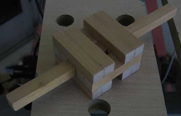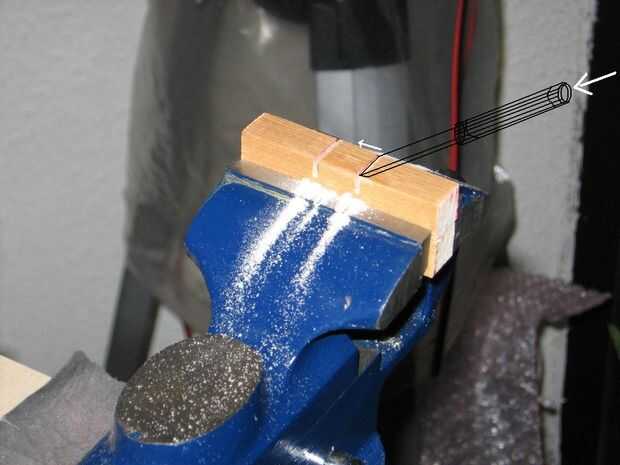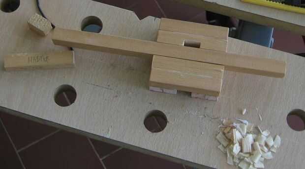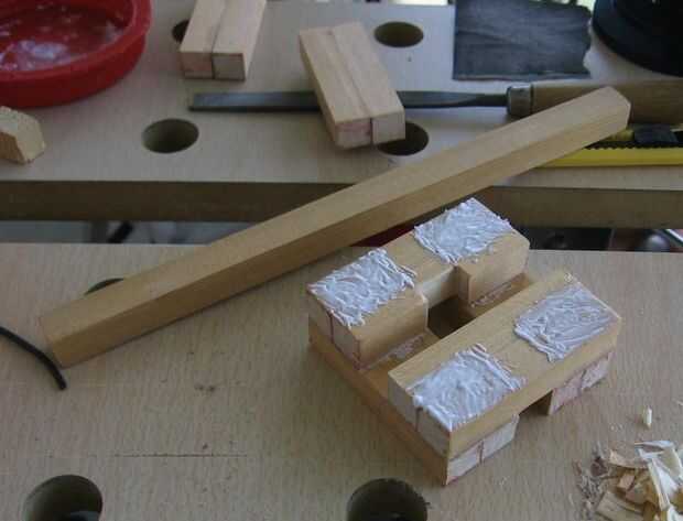Ahora pegue la capa inferior del cabezal a la capa media (foto 4). Con el pegamento aún mojado, inserte el rayo para ajustar y alinear a los pares de piezas. La viga se utiliza como separador. Ajustar las piezas para que el proyector se adapta sin lag y sin demasiado apretado. Hacer la viga funciona suavemente a través de la contrapunta.