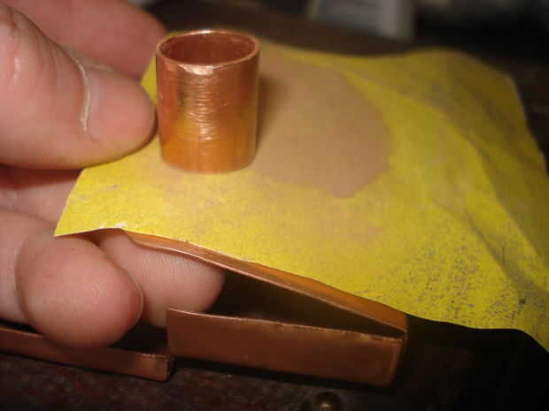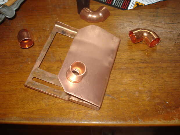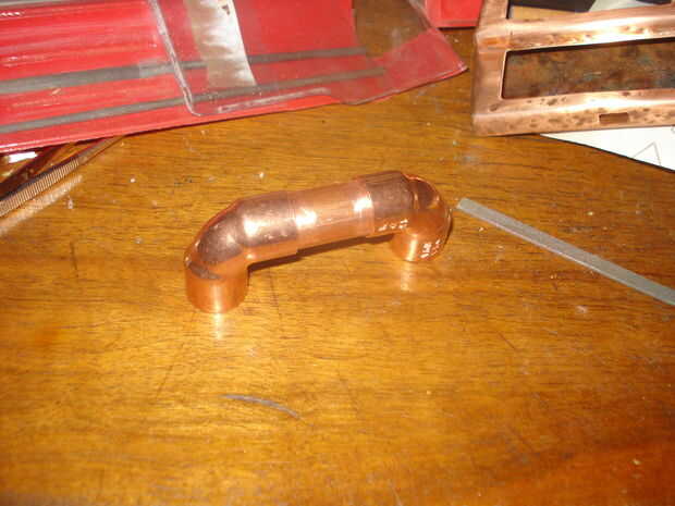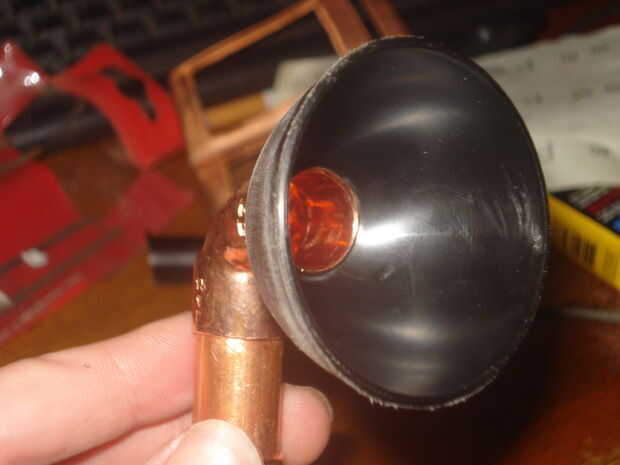Usé una sierra para cortar los tubos de cobre (btw. no el camino a seguir - utilizar un cortador de tubos si tienes uno) sólo necesitaba dos pedazos, uno de 6cm de largo y otra unos 2cm. Los codos eran un ajuste agradable y no veo la necesidad de soldar o pegar juntos - después de todo yo quería ser capaz de ajustar la orientación del cuerno.