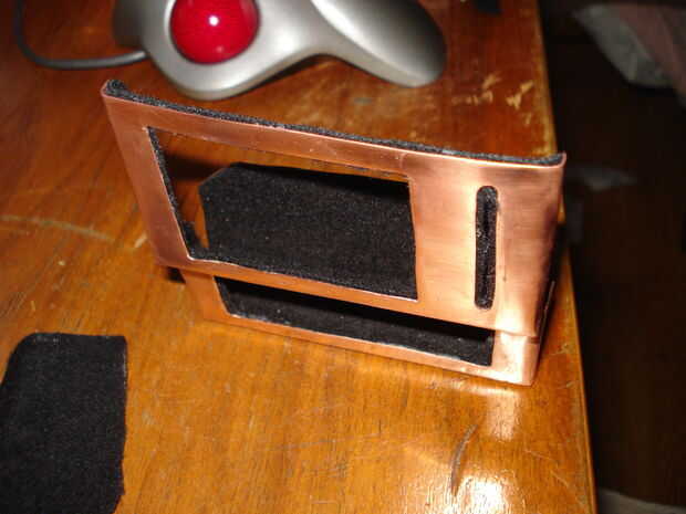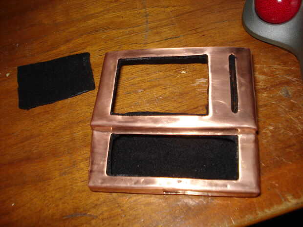Para hacer el forro de fieltro, usar la plantilla de papel para cortar el fieltro en forma. Después de eso, es volver a nuestro viejo amigo, pegamento. Usé un base de agua multiusos pegamento en cola en el revestimiento de fieltro - hasta ahora hizo el trabajo. Usé puntiagudos tijeras para cortar los agujeros después de que había curado el pegamento. Puede por supuesto tratar de cortar los agujeros primero, asegúrese de que el ajuste es perfecto y entonces tienen una lucha con lo que antes de que el pegamento empiece a curar - sea mi huésped.