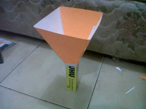 2 hacer 4 triángulo del papel del HVS. Corte la afilada parte (arriba) y luego conecte entre sí. Mira en la parte superior de la imagen.