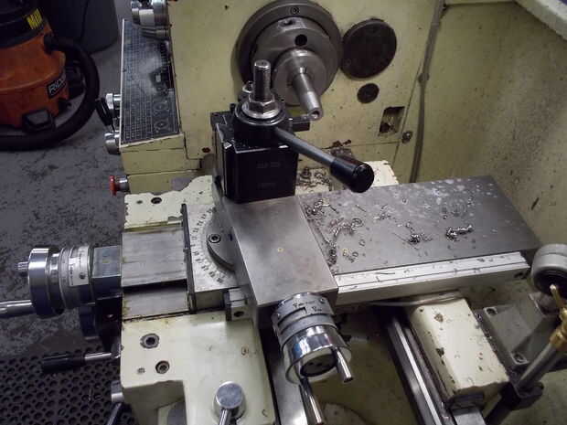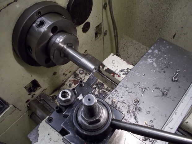 Con una herramienta de corte montada en el poste de la herramienta, configurar la diapositiva compuesta a aproximadamente 4 grados. Esto permitió cortar el cono en este extremo de la barra. El objetivo es estrechar la barra hasta 3/4" donde se acoplará con el soporte de la herramienta. Con el conjunto de diapositivas compuesto, usé los volantes X e Y para colocar la herramienta de corte justo a la derecha del extremo de la barra y que tendrá sobre un corte.02. Comencé el torno y utiliza la rueda deslizante compuesto para avanzar la herramienta de corte en la barra. Este corte una forma cónica. Volvió la cuchilla a la posición inicial, fue en otro.02 más o menos y tomó otro corte. Repetí como sea necesario hasta que el menor diámetro era de 3/4".