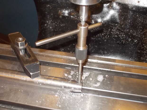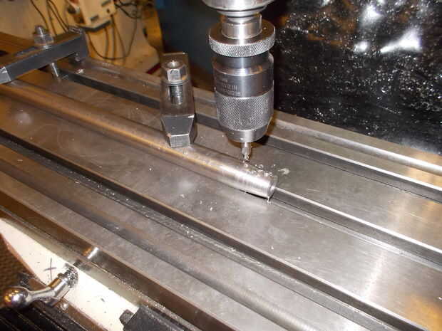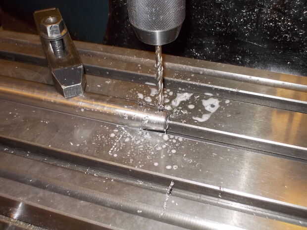 En el molino de chorro me sujeta la barra a la mesa del molino y había situado en la línea central de la barra y el extremo derecho. Había montado un mandril Jacobs en el eje del molino y fija un taladro de centro. I punto había perforado en 1/4" y 1" y reemplazar el taladro de centro con una broca #7 y perforar a través los orificios. Entonces había aprovechado ambos orificios 1/4-20.