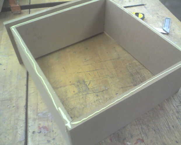 Montar las cuatro paredes del cajón mediante el encolado y brad clavado un empalme simple.