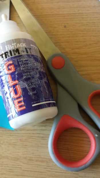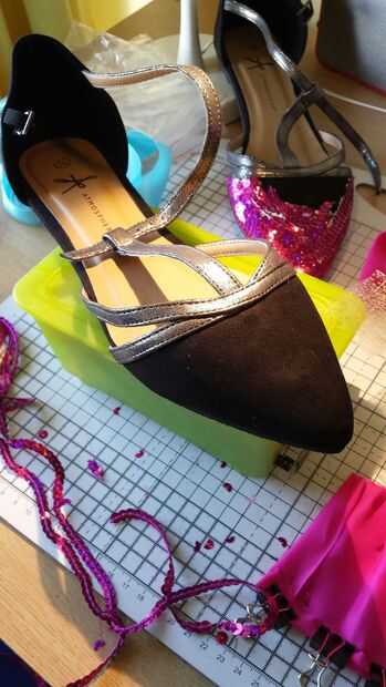 Vas a necesitar: pegamento para tela, lentejuelas, tijeras, cinta, material y unos zapatos.