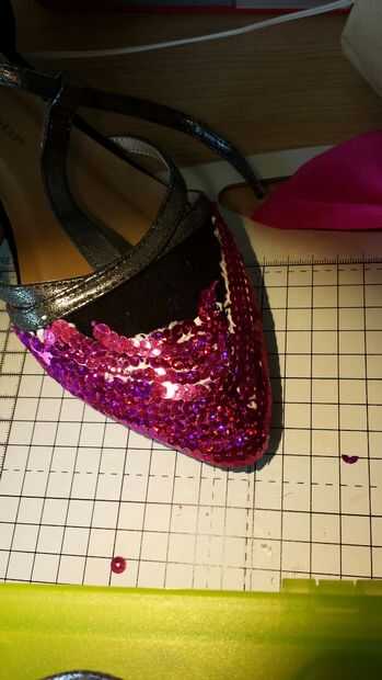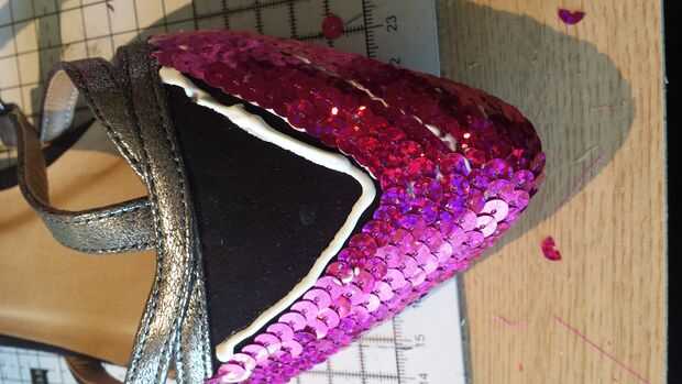 Trabajar en filas, ejecute una línea abundante de pegamento alrededor del borde del zapato. Mis lentejuelas son ensartadas tan fácilmente del palillo en una línea limpia. Mantener capas encima de las lentejuelas con un traslapo leve como la tablas o un barco. Dejé un parche que estaría cubierto por el arco, lo que significa que mi tela se pegaría a la tela, en lugar de lentejuelas.