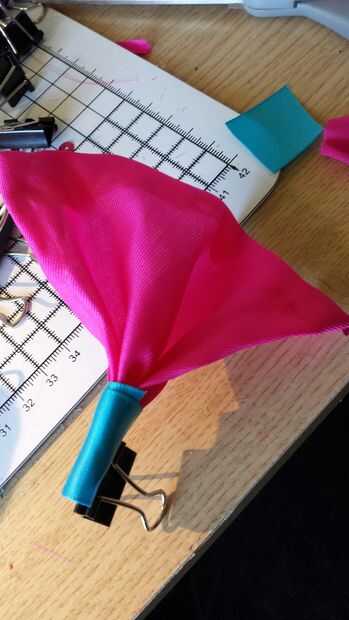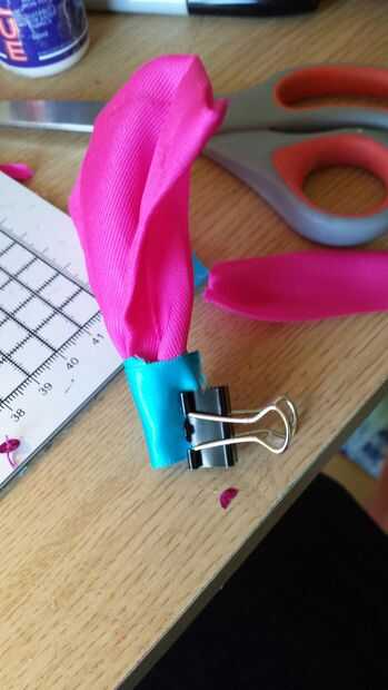 Forma de arco áspero de cortar y pegar los bordes sobre sí mismas para mantener un borde limpio. Abrazadera mientras que se seca, utilicé clips bulldog. Crujir un extremo y envolver en cinta, pegamento final y abrazadera againto seco.