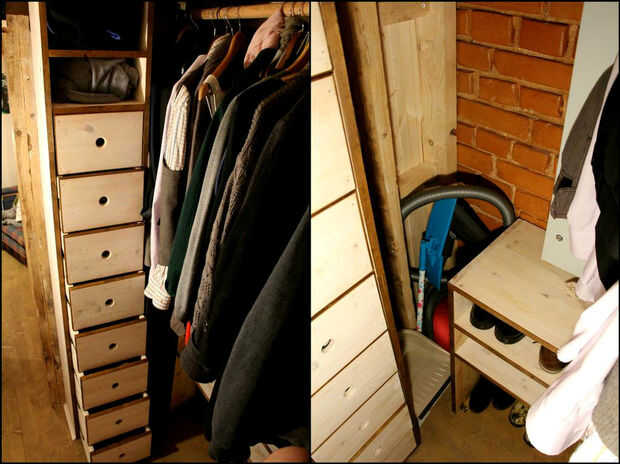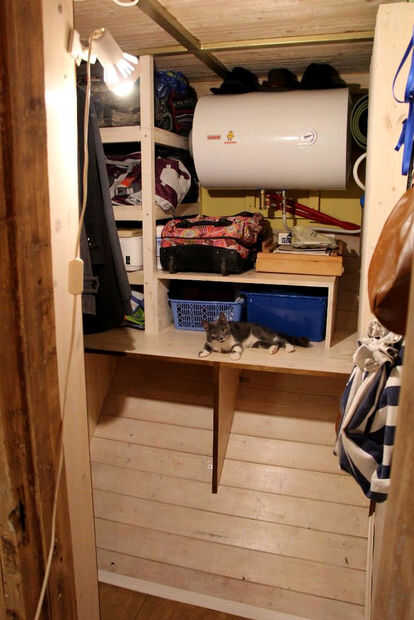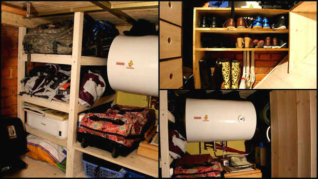 Dentro del armario, como se puede ver, tenemos un bastidor para bolsas grandes, una esquina limpia para aparatos de limpieza y un zapatero. También construí un armario alto con ocho cajones y dos estantes. Todavía tengo que construir un cajón grande y dos cajones triangulares. Blanco lo grande que es el calentador de agua que es filtro de agua y tuberías. Detrás de la ropa de colgar es el tablero de distribución.