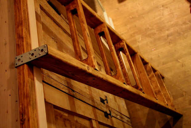 Para ello he construido una escalera simple de 2 X 4-s. Cuando no utilice la escalera se ajusta entre puerta izquierda y la tabla de la computadora. Para facilitar el subir para arriba he añadido 2 X 2 a la cama y soportes en L en la escalera. De esta manera la escalera ganchos a la cama y hace subir más seguro. Tres pasos tienen ranuras en ellos para que nosotros les podríamos cangrejo más fácilmente.