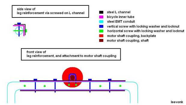 (3) véase el diagrama abajo para reforzar las piernas por lo que puede ser atados muy firmemente a los motores. Para asegurarse de que unieron bien utilicé un pedazo de ángulo recto de acero para sujetar el tubo a los dos lados. Utilice las tuercas de fijación y bloqueo arandelas aquí.