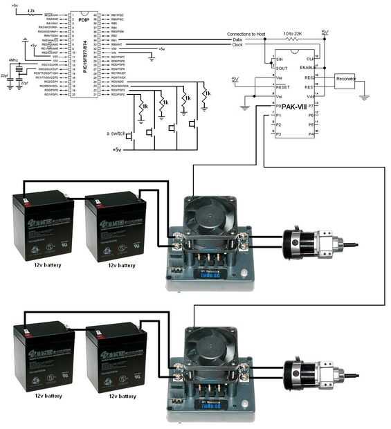 Para permitir que el PIC controlar los motores mientras que también hace otras cosas (como escuchar a los comandos, o lo que sea), usted querrá utilizar un coprocessor de modulación (PWM) de ancho de pulso como el VIII de PAK. Este chip tiene un valor registrado del PIC y se encarga de enviar el pulso correcto ancho comandos al regulador Victor 885. Ingeniárselas para interfaz del PIC por medio del software era un poco de dolor, usted puede descargar el código que usé (LBigWalk.bas).