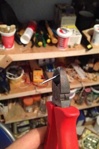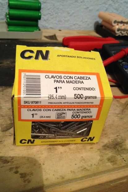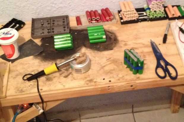 Primera cinta de las células en los sistemas paralelos. Entonces los conjuntos juntos alternando positivo por positivo hacia abajo de la cinta y todos juntos la cinta. Usé clavos pequeños para conectar los paquetes. Cortar la cabeza del clavo, la arena y la parte superior de las células y el clavo a los paquetes de la soldadura. Mantiene las 4 células juntos de los paquetes. Al soldar en el lado positivo es super importante no soldar en los lados de la parte superior de la batería. El exterior de la batería es negativo por lo que la célula se corta hacia fuera.