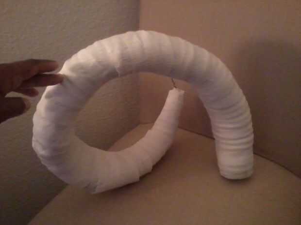 Desde este punto usted volvería a su molde de cuerno original que todavía está envuelto en papel de cera y comenzar el proceso de envolver en la barra de soporte de espuma, luego quitarlo de la forma y envolviéndolo en papel crepe para hacer un segundo cuerno.