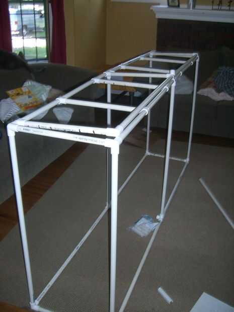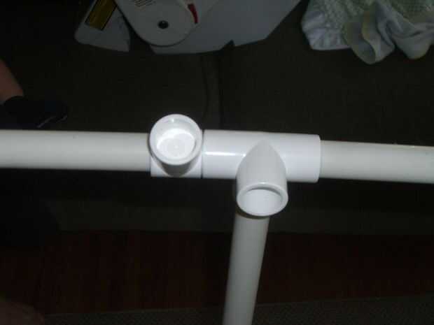 Notar cómo me resbalé en las guarniciones de la t de PVC en el tubo. He utilizado 3 en uno y 4 por el otro, el extra en un lado era un apoyo para el centro de la tapa.